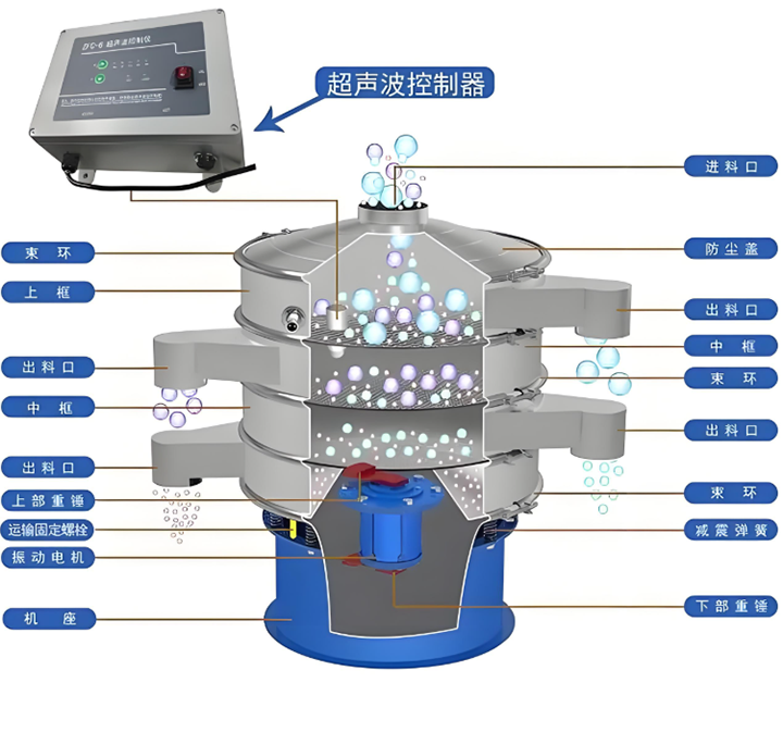 超聲波振動篩廠家生產(chǎn)的通用結構是振動源、篩箱、篩網(wǎng)、超聲波系統(tǒng)及減震裝置等。振動源為物料輸送供能;篩箱是物料篩分核心空間,內(nèi)部裝有200目或500目等不同目數(shù)的篩網(wǎng),篩網(wǎng)通過專用張緊裝置固定以保穩(wěn)定;超聲波系統(tǒng)含超聲波發(fā)生器和換能器,換能器可破物料團聚、防堵網(wǎng);減震裝置裝于設備底部,能吸收設備運行振動,減少對地面及周邊設備影響,同時保障設備穩(wěn)定運行。我廠的超聲波發(fā)生器分為內(nèi)置式和外置式,并且我廠的超聲波振動篩有法蘭式,能夠使物料輸送無泄漏。
