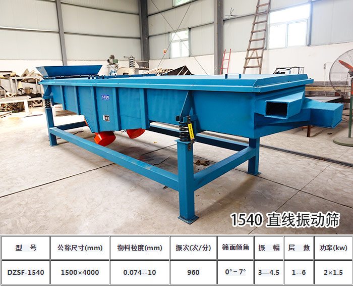 1540直線振動(dòng)篩長(zhǎng)為4000mm、寬為1500mm,它每小時(shí)可滿足3000KG左右產(chǎn)量需求。